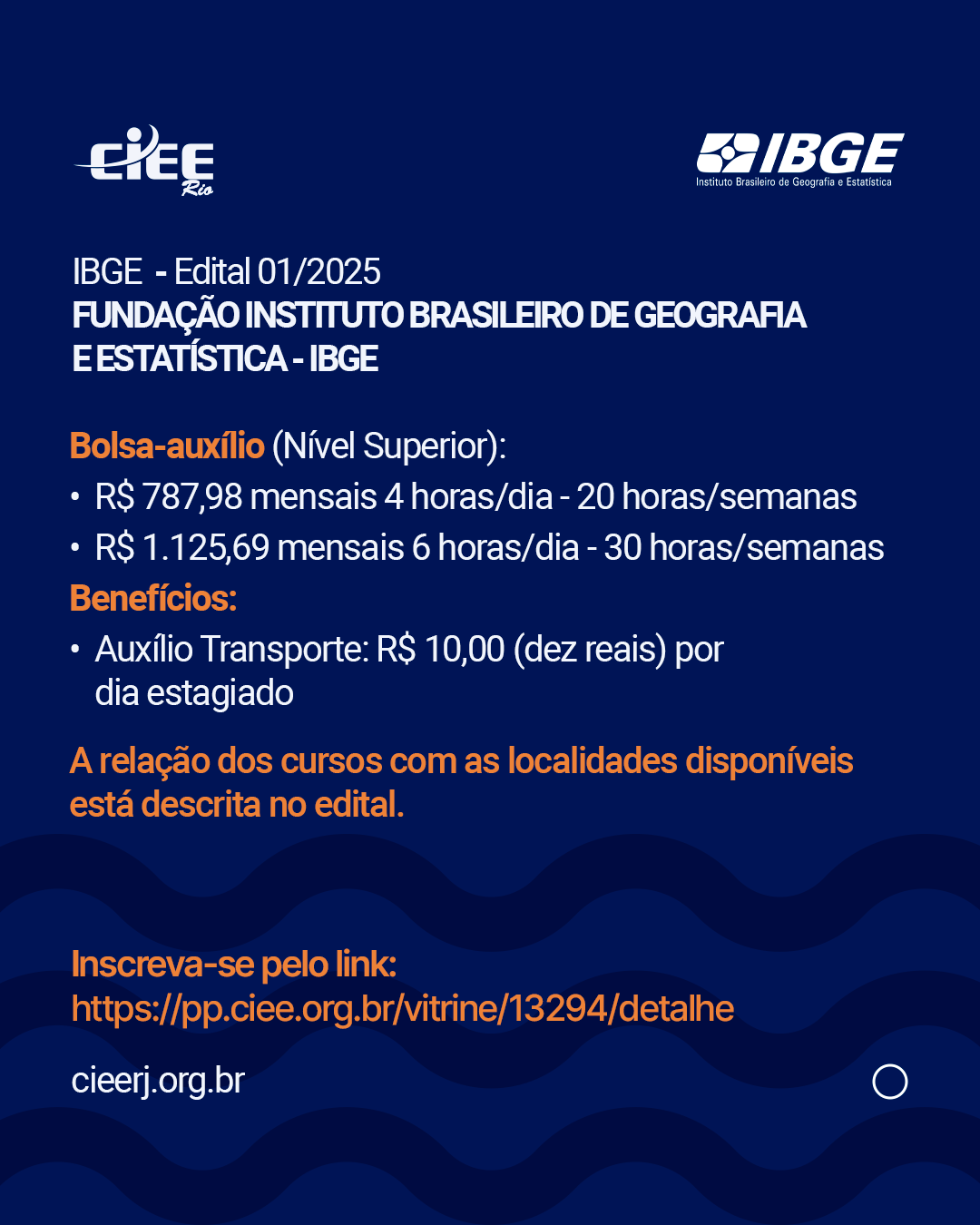 O IBGE e o CIEE Rio estão realizando um processo seletivo para o programa de estágio. As inscrições estão abertas, com vagas disponíveis nos cursos de Administração, Ciências Contábeis, Comunicação Social, Geografia, Geologia, Geoprocessamento e cursos relacionados à Informática, como: Análise de Sistemas, Análise e Desenvolvimento de Sistemas; Ciência da Computação; Engenharia da Computação; Engenharia de Redes de Computadores; Gestão da Tecnologia da Informação; Sistemas de Informação; Sistemas de Internet; Tecnologia em Sistema de Informação e Engenharia de Software.